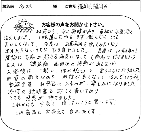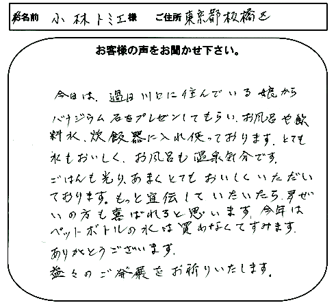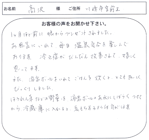 入浴用、飲用、炊飯用と沢山のご愛用とすばらしいご意見誠にありがとうございます。温まることは万病予防と言われております。ご家族皆様のご健康をお祈り申し上げます。今後ともよろしくお願い致します。感謝。