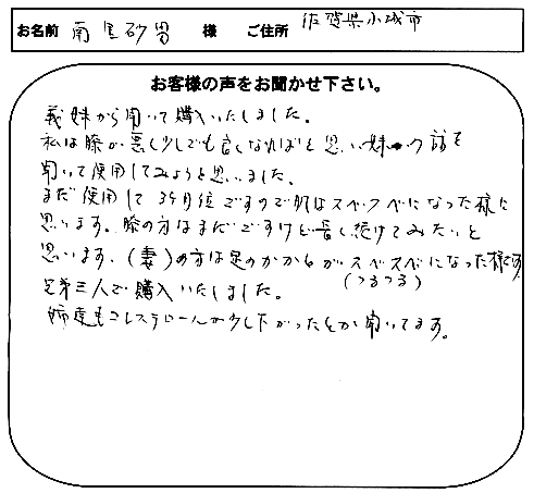 小島様にはその後合計5度の再注文をいただき、誠にありがとうございました。今年の元旦の第1号のお客様も小嶋様の再注文でした。ご友人の皆様にも宜しくお伝え下さい。本当に感謝、感激しております。その後、再度ご感想を送っていただきました。ありがとうございます。