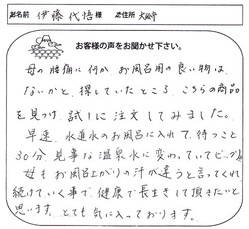 溶岩温浴ですがその後も非常に調子が良いです。疲れていてもお風呂に入ると次の日はすっきりというかんじです。それにお肌が若返ってるので、美容に良いですね。これからも少しずつですが広めていきたいと思っております。