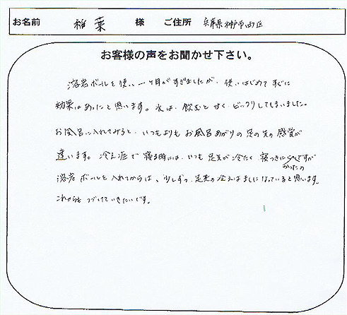 浄水用、お風呂用と様々お試しいただき、すばらしいお声を誠にありがとうございました。溶岩ボールで入浴するとお肌や髪の毛がツルツルになります!というお声は、他にも沢山のお客様からいただいております。冷えのきつい方の場合、長原様のように通常よりも重量を増やしていただく方が温浴作用は高くなりますので、断然おススメです。今後ともご愛用宜しくお願いいたします。感謝。